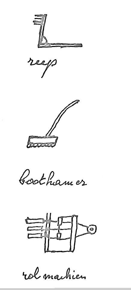 Na de rolmachine kwam een machine met hamers. Zij was voorzien van hamers (4-6-8) van dertig cm. bij 10 cm. breed en een halve cm. dik. Deze werden vastgemaakt aan een houten lat, op het einde vastgehouden door een as in het midden opgehouden door een veer die verbonden was aan de bovenkant met een krukas die de hamers op en neer in beweging bracht. Deze krukas was zo ingesteld dat de hamers om beurten op en neer bewogen; deze hamers klopten op een houtblok van tien tot vijftien cm. dik, waar de vlastoppen tussen gedreven werden en de zaadbollen geplet.