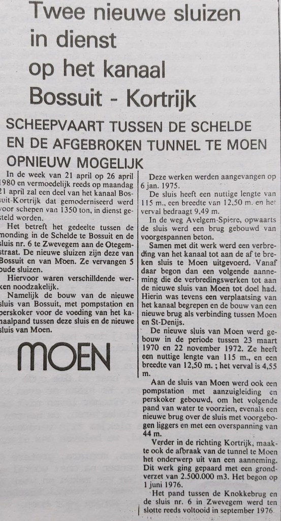 We volgden allemaal het verloop der werken; vandaag is dit huis afgebroken; nu is dit ook al weg; tot de verandering zo groot was dat je jezelf als een vreemde voelde; als je vanuit de richting Sint-Denijs Moen binnen kwam was het alsof het voorste deel van Moen door een bomaanval totaal werd plat gelegd; al de huizen van de Sint-Denijsstraat tot aan de fabriek waren verdwenen; het voetwegeltje vanaf de brug met een boog naar de hoek waar vroeger de H. Hartkapel stond; rechtover de Kapellestraat was het eerste weggewerkt, want daarover zou de nieuwe brug komen.