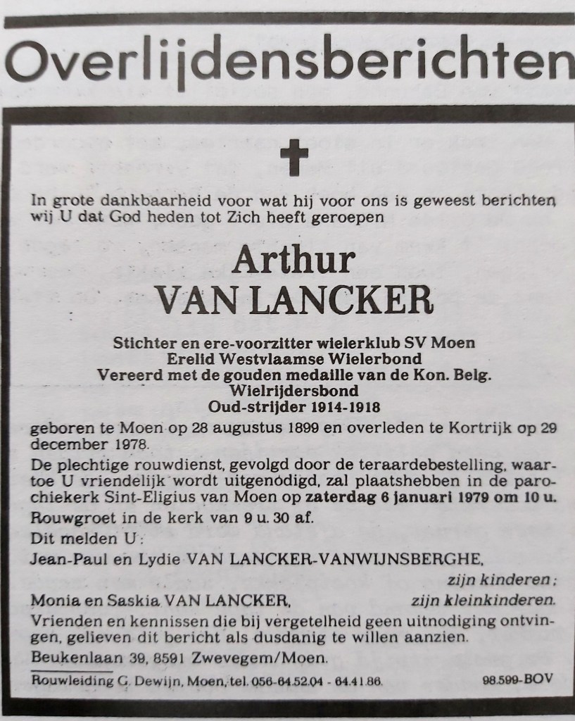 Toen Arthur Van Lacker omtrent 75 jaar was, hoorde ik toevallig dat hij door het afsterven van een buur en leeftijdsgenoot veel verdriet had en zegde: Nu zijn er niet zoveel meer, weldra is het mijnen tijd.